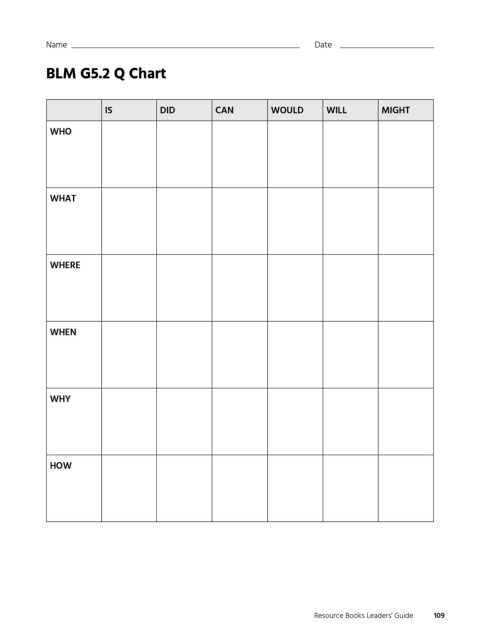 Name Date BLM G5.2 Q Chart IS DID CAN WOULD WILL MIGHT WHO WHAT WHERE WHEN WHY HOW Resource Books Leaders’ Guide 109