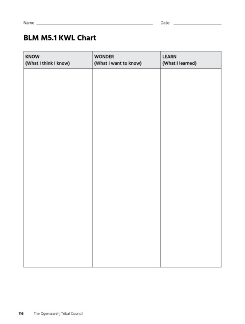 Name Date BLM M5.1 KWL Chart KNOW WONDER LEARN (What I think I know) (What I want to know) (What I learned) 116 The Ogemawahj Tribal Council
