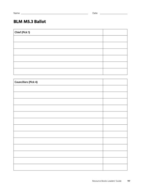 Name Date BLM M5.3 Ballot Chief (Pick 1) Councillors (Pick 4) Resource Books Leaders’ Guide 117