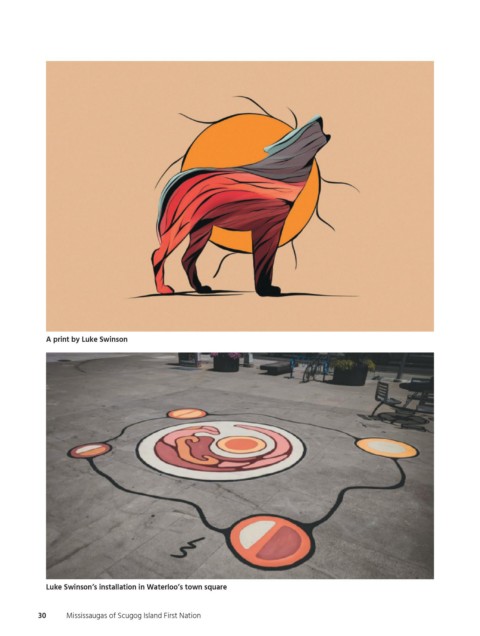 A print by Luke Swinson Luke Swinson’s installation in Waterloo’s town square 30 Mississaugas of Scugog Island First Nation ogemawahj_community_book4.indd 30 2019-02-27 10:39 AM